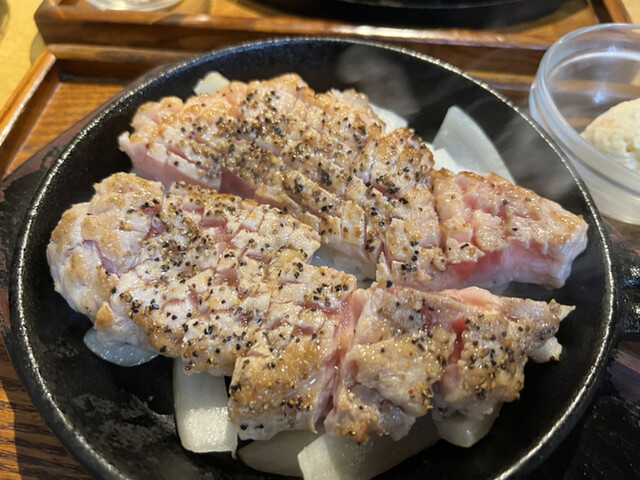 まもなく、ジュージューと熱気を放つ小さなフライパンに入った豚肩ロースステーキが出てきた! 肉の下には玉ねぎを敷いて一生懸命茶色の玉ねぎに変わっていたし、肉にコショウと塩で基本シーズニングをしたのも見られた。