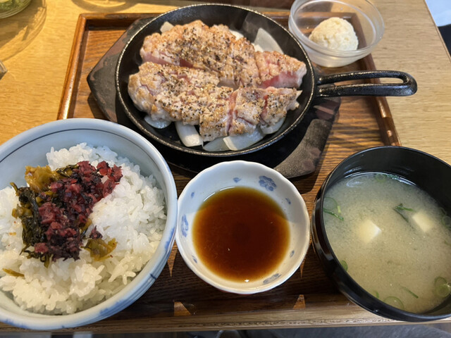 膳立てはステーキにご飯、味噌汁、ジャガイモサラダと醤油タレでできていた。